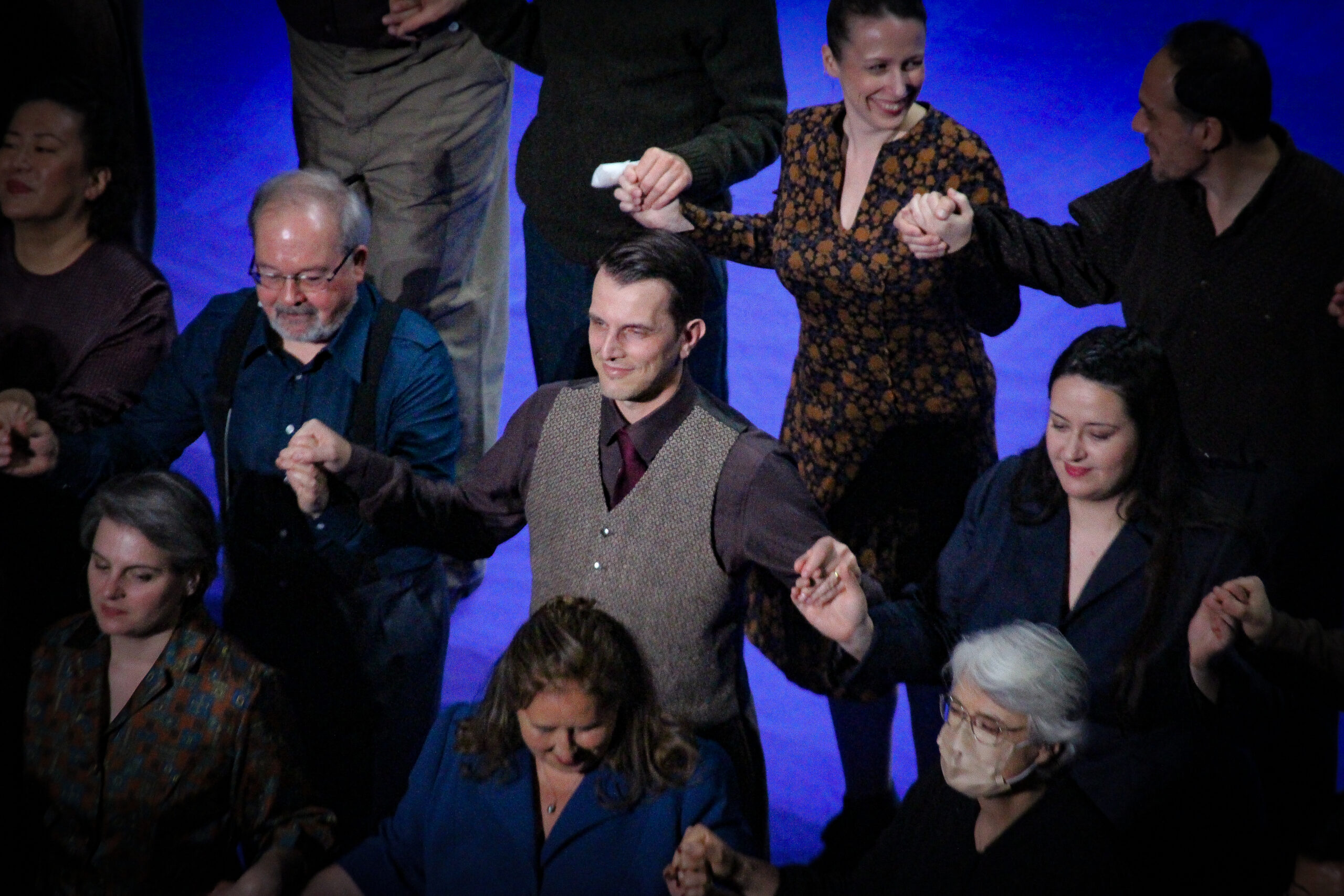 la partition ne manque pas d’atouts pour se substituer à l’exigence classique de récit et d’intelligibilité. Hélas, un autre détail qui n’en est pas un nous fait tiquer : l’omniprésence des danseurs (la mise en scène est signée Bobbi Jene Smith et Or Schraiber, chorégraphes) chiffonne. Pour quelques ensembles réussis, elle brasse beaucoup d’air – parfois au sens gestué du terme – comme si elle se méfiait du pouvoir de séduction de la musique. Dès lors, elle donne l’impression de s’agiter pour retenir l’attention du spectateur, s’apparentant en conséquence à du bruit visuel censé retenir le spectateur grâce à des contorsions dont la nécessité artistique n’est pas patente, euphémisme. On eût préféré jouir sans larsen oculaire des astuces que déploie le compositeur pour varier ses instruments choral