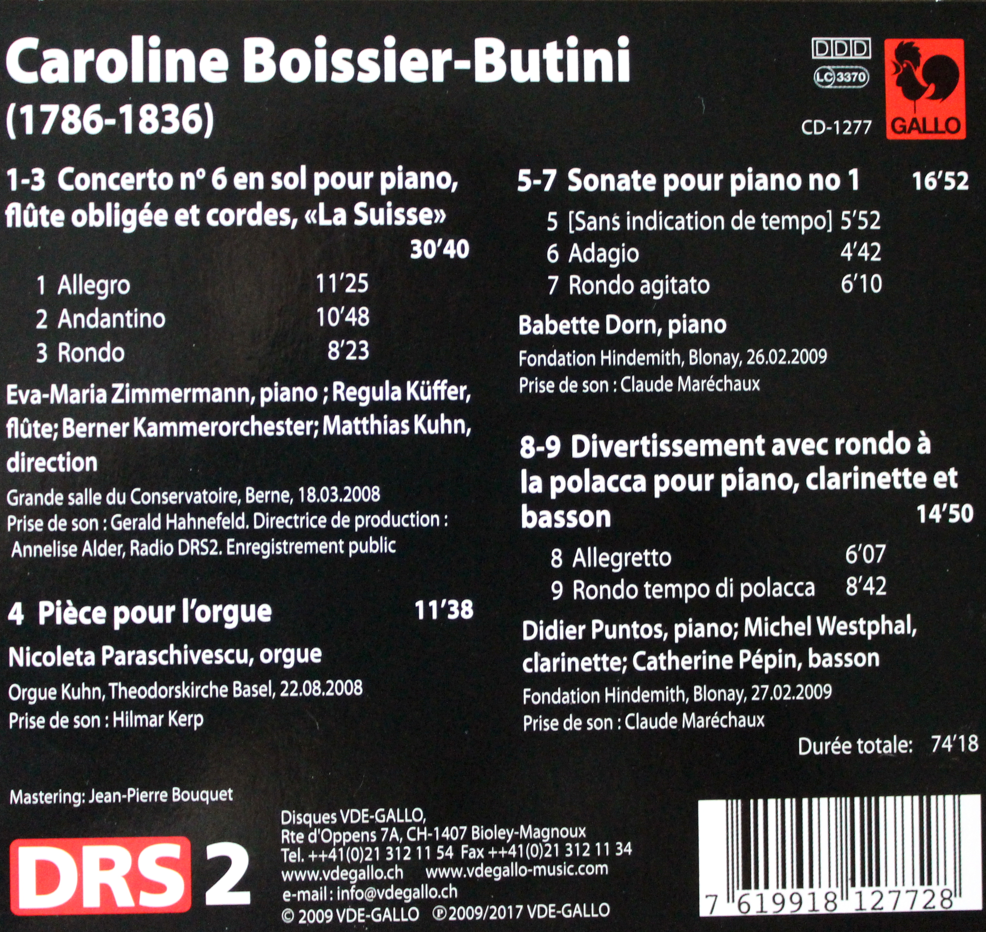 Il existe, en musique classique, un continent appelé Marché de niche que peuplent raretés et oubliés de l’Histoire – ceux que l’on n’ose pas appeler les compositeurs inconnus, puisque, apparemment, quelques personnes bien intentionnées les connaissent, les estiment et tenteraient, si le terme existait, de les prosélyter. VDE-Gallo fait partie des défricheurs de ces territoires, comme en témoigne son attention à Caroline Boissier-Butini (1786-1836). En effet, le label a produit trois enregistrements de ses œuvres : deux pour piano seul, et un pour instrumentarium varié dont il sera question ici.