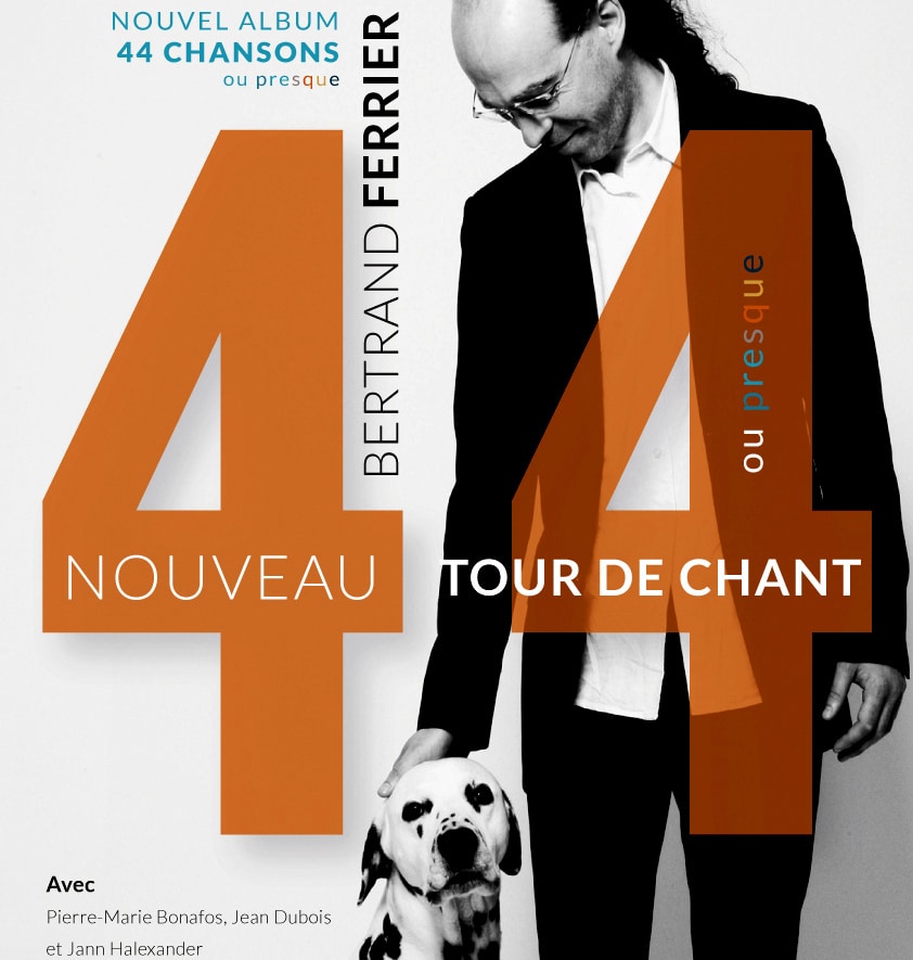 Ceci est un concert de chansons avec du texte dedans et de la musique autour, et vice et versa. Ça dure une heure, c’est 10 € l’entrée. Mais ceci n’est pas vraiment un concert. C’est une fête en chansons pour lancer le disque 44 ou presque. Le disque 44 ou presque, lui-même, n’est pas un disque. En fait, c’est un double disque mais il en contient quatre, pour 160′ de musique.