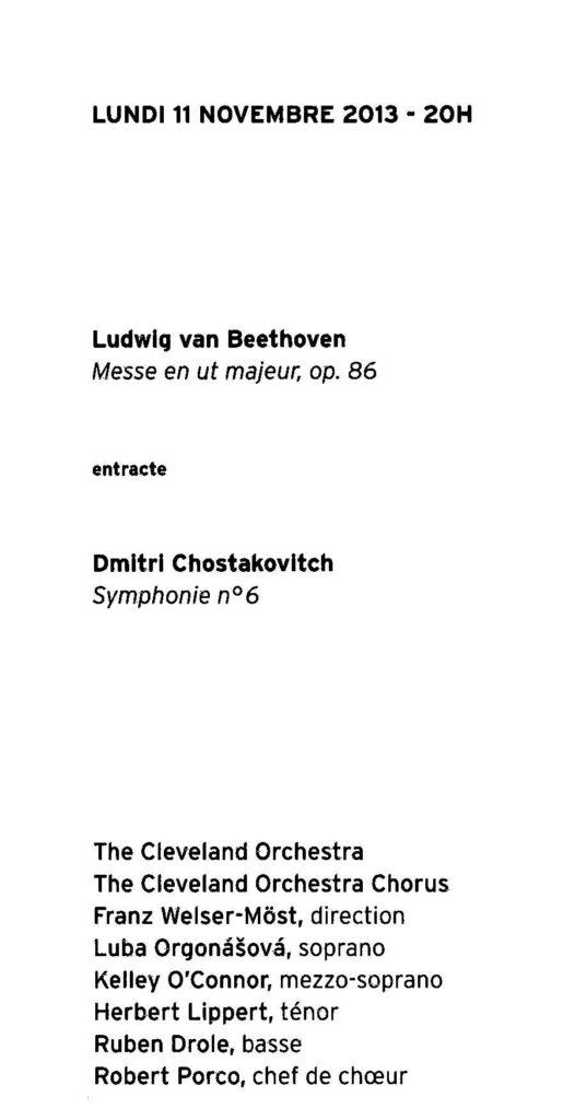 Deux œuvres sont au programme. Le concert s’ouvre par la Messe en ut majeur de Ludwig van Beethoven (42′). Réputée pour avoir été massacrée à sa création, plus de deux siècles plus tôt, la composition s’inscrit dans la tradition classique de la musique de commande. Elle donne l’occasion d’apprécier la qualité d’un orchestre au son riche et aux bois remarquables ; celle aussi de noter la belle homogénéité du chœur, bien que certains départs « bavent » un tantinet (ainsi du « Chr/chr/christe ») et quelques attaques paraissent pas tout à fait justes ; celle enfin de s’offusquer des prestations des solistes mâles. Ruben Drole, basse, manque de graves et poitrine pour impressionner : effet raté. Quant à Herbert Lippert, en dépit d’une prestance à l’américaine, il ne fait pas longtemps illusion. Ses dernières interventions à découvert tournent au grotesque, avec cette émission ténue et cette imprécision fragile qui occasionnent des notes et des sons pour le moins saugrenues. Après des premières notes hésitantes, Luba Orgonášová, sosie capillaire de feue Marie-Claire Alain, assure vaillamment sa partie ; la mezzo Kelley O’Connor semble tenir la route malgré des changements de registre qui paraissent parfois perfectibles. Ce nonobstant, les quatuors ne sonnent pas si mal, et la partition est idéale pour découvrir orchestre et chœur, grâce à la variété des effectifs requis pour chaque séquence. Sur l’interprétation elle-même, on eût sans doute apprécié plus d’allant et plus d’énergie, afin de mieux goûter les passages plus posés, ici un chouïa noyés dans une manière de retenue permanente, belle mais un peu mouchmolle : on attend plus de l’orchestre vedette !