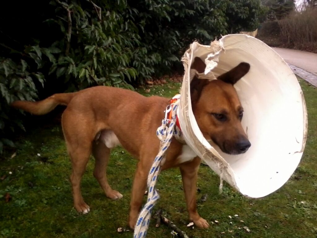 Dalinka est un american staff et presque une antiquité puisqu’elle a huit ans. C’est quasi un cochon truffier, sauf qu’elle ne cherche pas les truffes. En bon terrier, elle inspecte l’environnement, elle accepte les câlins, elle fait groïnk-groïnk, et on se demande bien : quoi d’autre ? (La muselière OBLIGATOIRE était toute proche, bien sûr, je l’ai juste effacée pour la photo, vous pensez.)