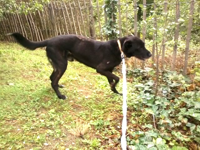 Et histoire de ne pas se laisser impressionner par la pluie ou les cons, il était temps de s’balader avec un jean’s, en l’espèce Mr Levi’s. Il a une tête à faire presque peur aux sots, pourtant dans la vraie vie il est : dynamique, rigolo, curieux, très affectueux et malin. Puisse-t-il dégager vite fait d’un chenil où il n’a rien à faire… comme les autres, mais en facile.